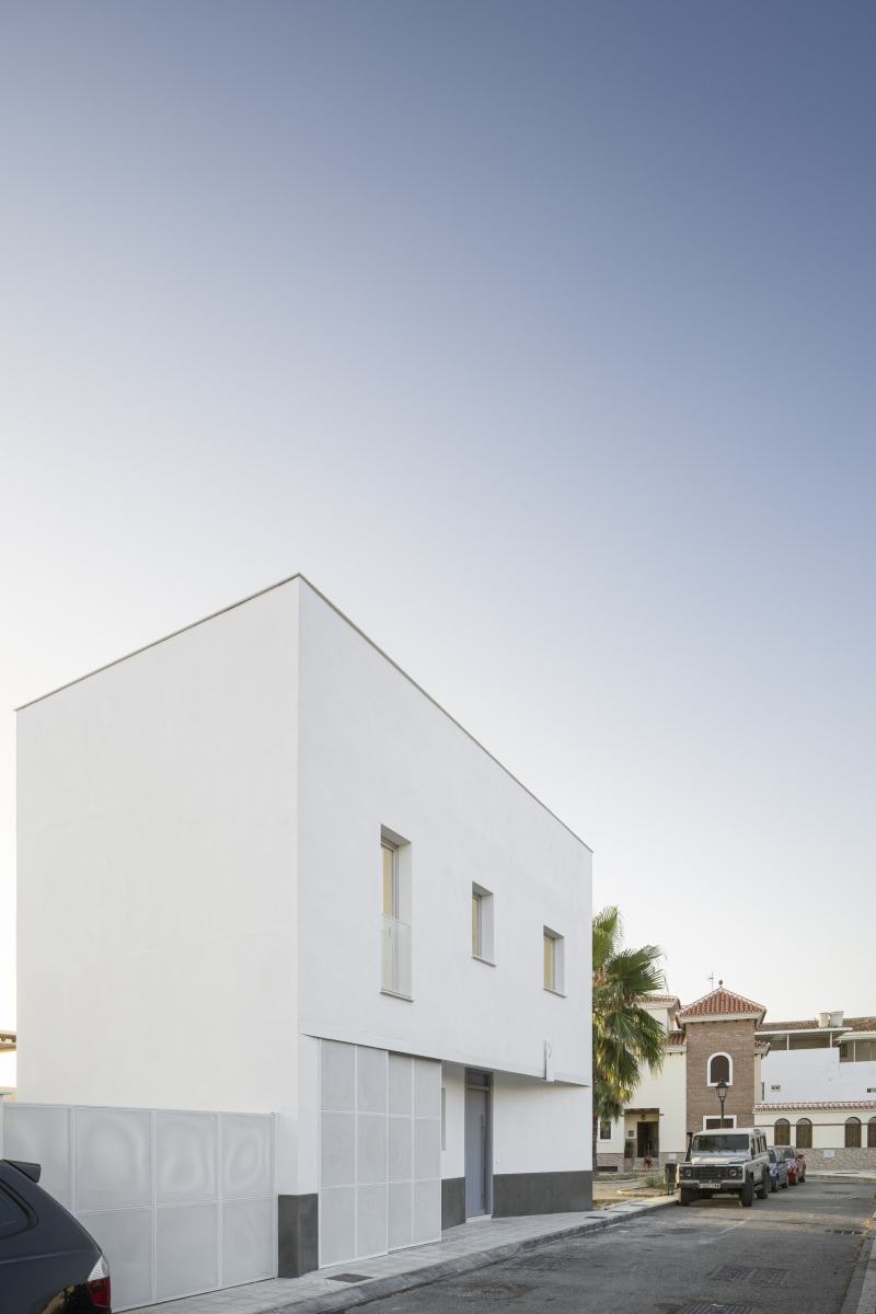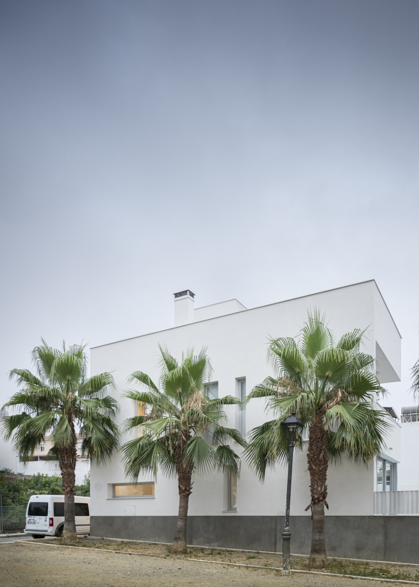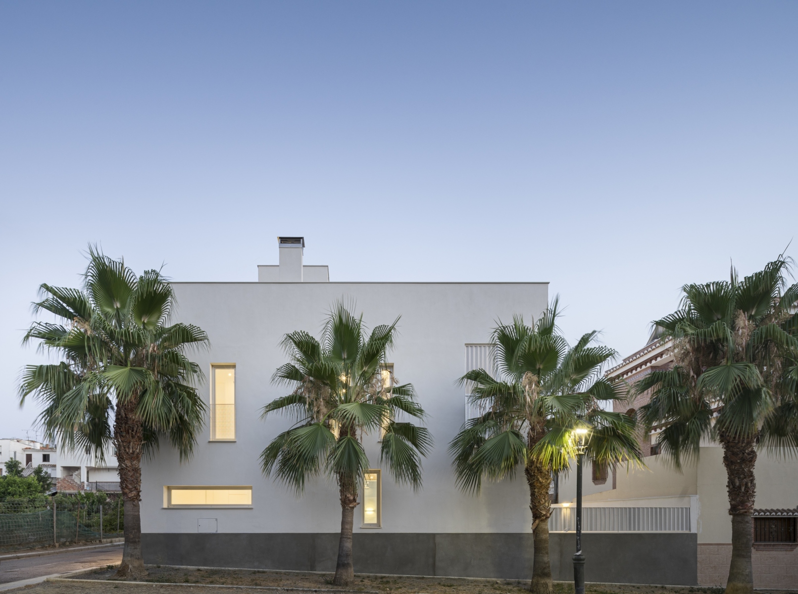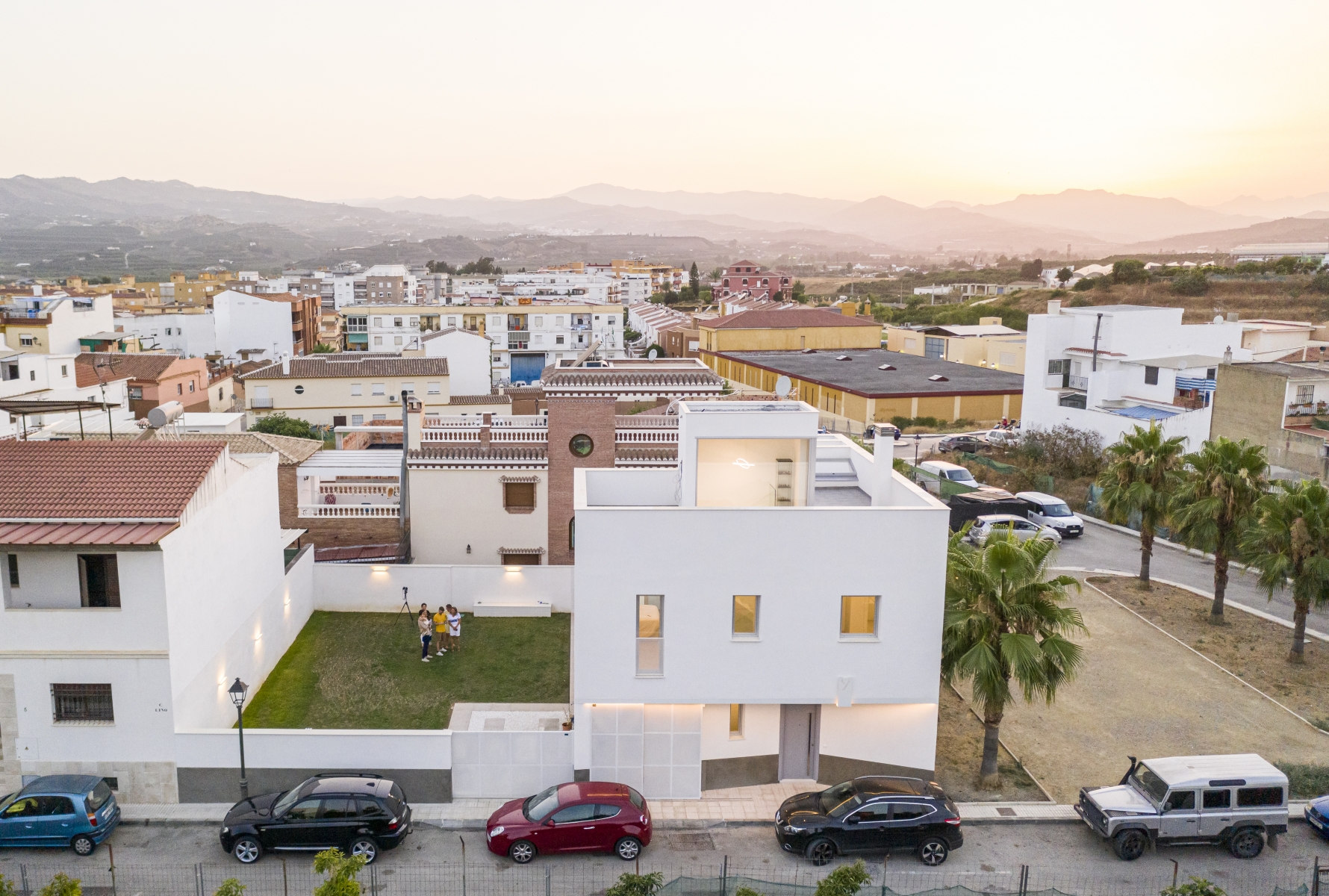 El diálogo entre las torre-alminares de la época mudéjar, tan presentes en el municipio de Vélez-Málaga y la Axarquía, y la chimenea de la antigua fábrica de orujo con el proyecto, se traduce en la materialización de un gran volumen de ladrillo cerámico cara vista hacia las tres fachadas exteriores del solar. Hacia el interior, un gran patio blanco perfora el volumen, generando viviendas con dobles ventilaciones e iluminación natural.